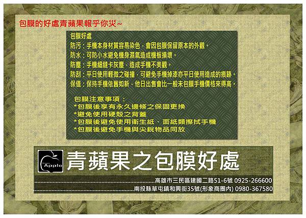 南投/草屯/竹山/埔里/高雄/台南/屏東/包膜最佳推薦青蘋果greenapple - 各式3C產品包膜、螢幕保護貼、包膜手機、包膜平板、包膜筆電、包膜相機、防指紋螢幕保護貼、9H抗刮螢幕保護膜(鋼化膜)、正版授權KITTY保護膜、抗藍光膜